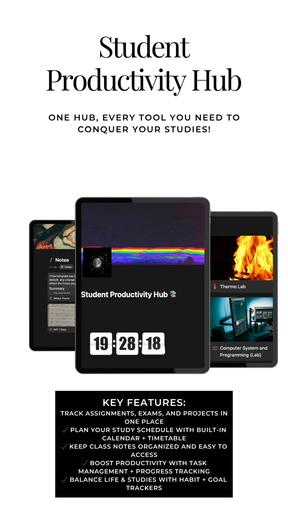 Assignment tracker, exam planner, notes hub, habit tracker, spotify inkage